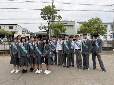 社中生が校区内の小学校に出向き、合同あいさつ運動を行いました。1年生も多くの生徒が参加し、元気なあいさつを広めることができました。去年まで一緒に通っていた中学生を見つけ、小学生が喜んでいる様子も見られました。